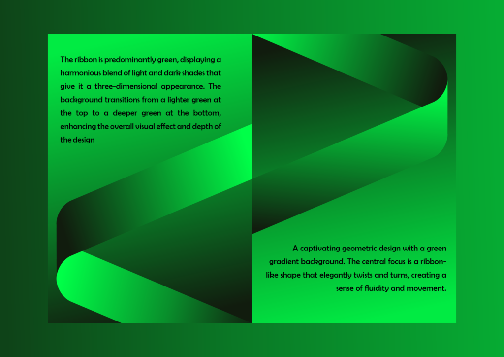 This flyer design exudes dynamic fluidity, with a ribbon-like form twisting elegantly against a lush green gradient backdrop. The interplay of light and shadow with rich emerald hues evoke harmony