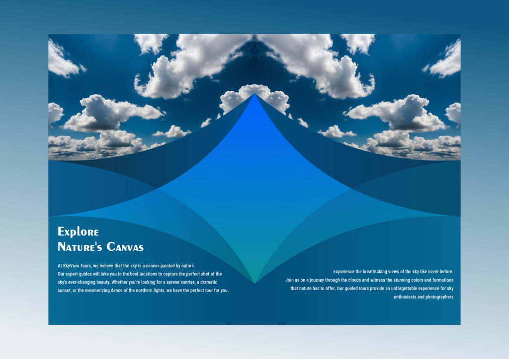 Flyer template with layered shades of blue forming a geometric diamond. The symmetrical arrangement of clouds enhances the depth and serenity of the scene